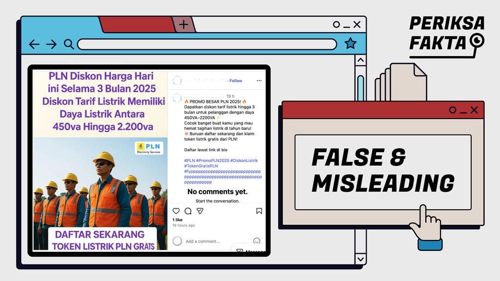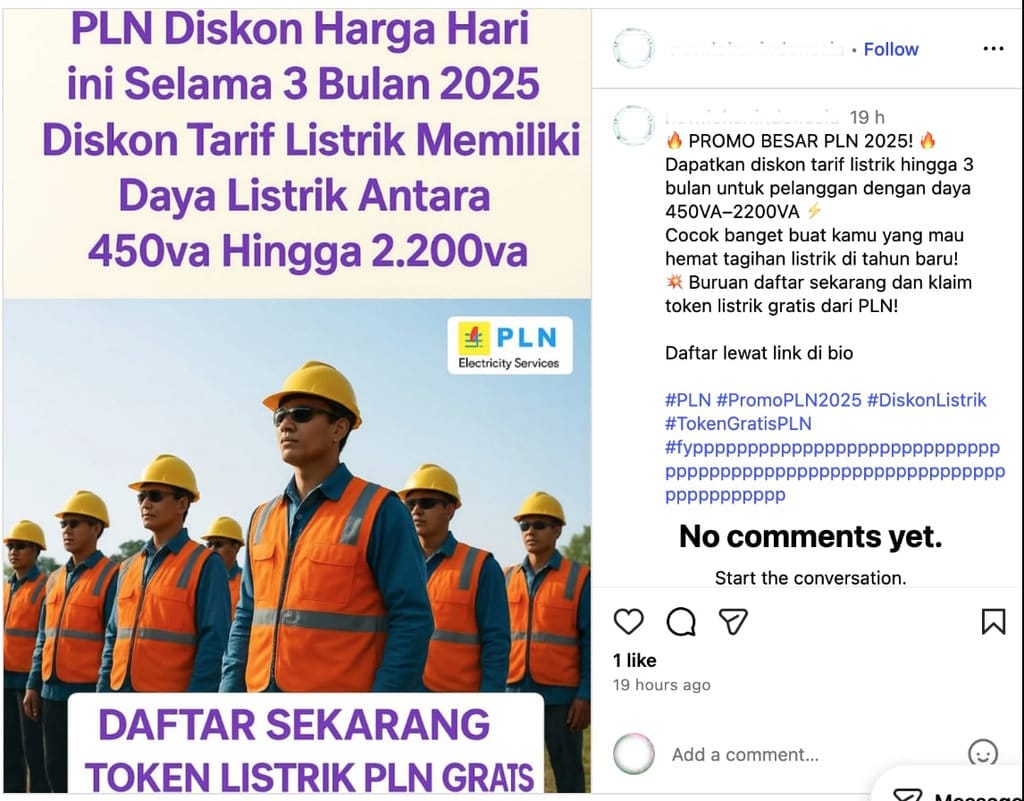 Namun, belakangan, beredar di media sosial informasi dan tautan pendaftaran yang diklaim merupakan bantuan dalam bentuk diskon token listrik gratis selama 3 bulan, bagi masyarakat yang memiliki daya 450 volt ampere (VA) hingga 2200 VA. Informasi tersebut dibagikan di Instagram oleh akun “new.loker.indonesia” (arsip) pada Selasa (4/11/2025).