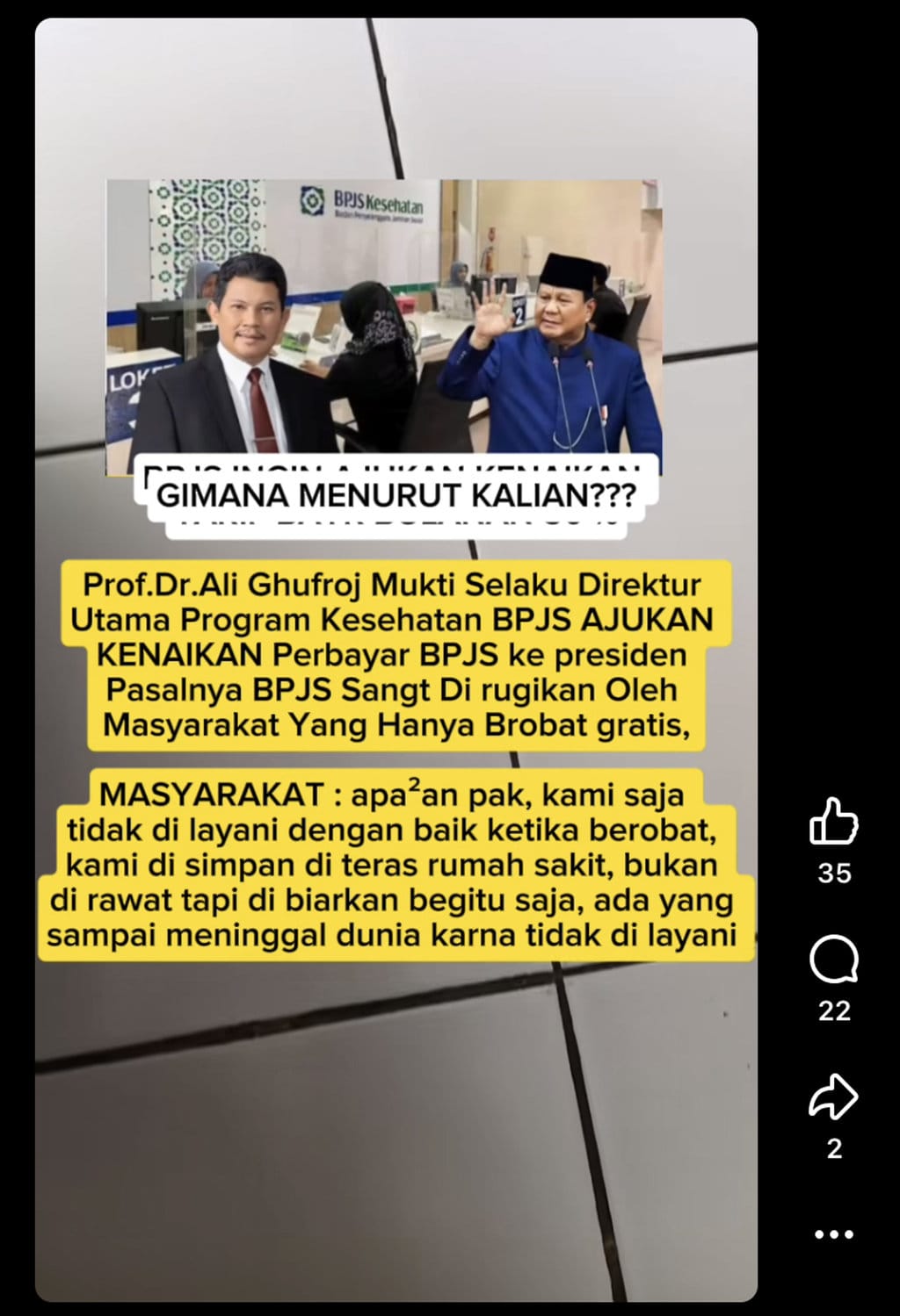 Unggahan ini disertai gambar Prof. Dr. Ali Ghufron Mukti dan cuplikan narasi berisi keluhan masyarakat terhadap layanan BPJS Kesehatan.