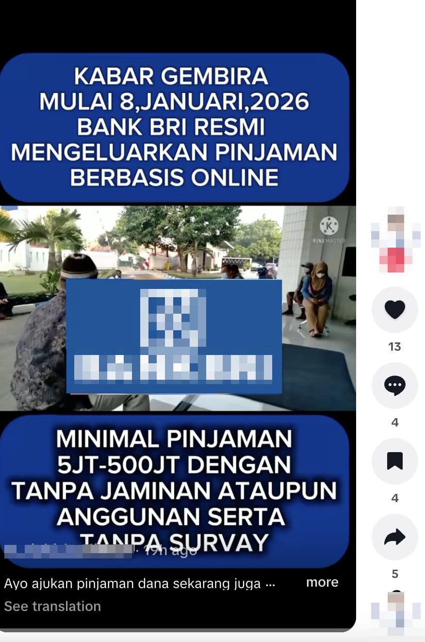 “Kabar gembira mulai 8 Januari 2026 Bank BRI resmi mengeluarkan pinjaman berbasis online. Minimal pinjaman 5jt-500jt dengan tanpa jaminan ataupun anggunan serta tanpa survay.” begitu klaim yang dituliskan dalam unggahan video.