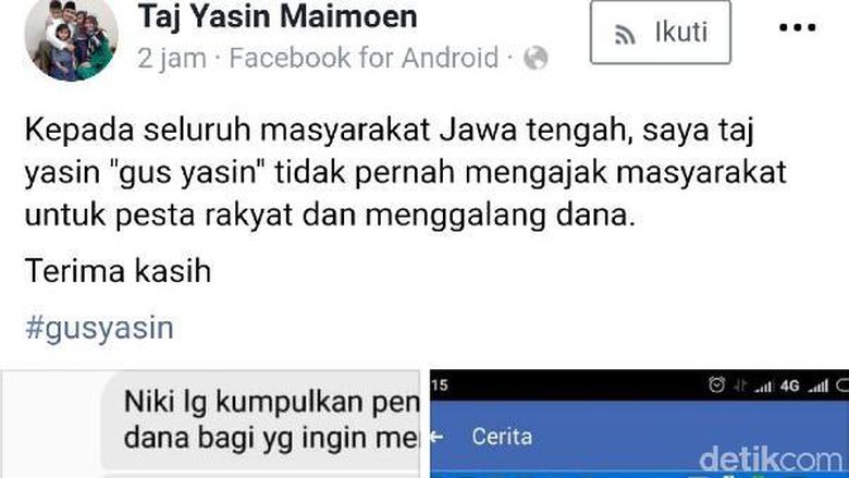 (GFD-2018-214) [HOAKS] Cawagub Jateng Taj Yasin Minta Sumbangan Pesta Rakyat Kemenangan Pasangan Ganjar-Yasin