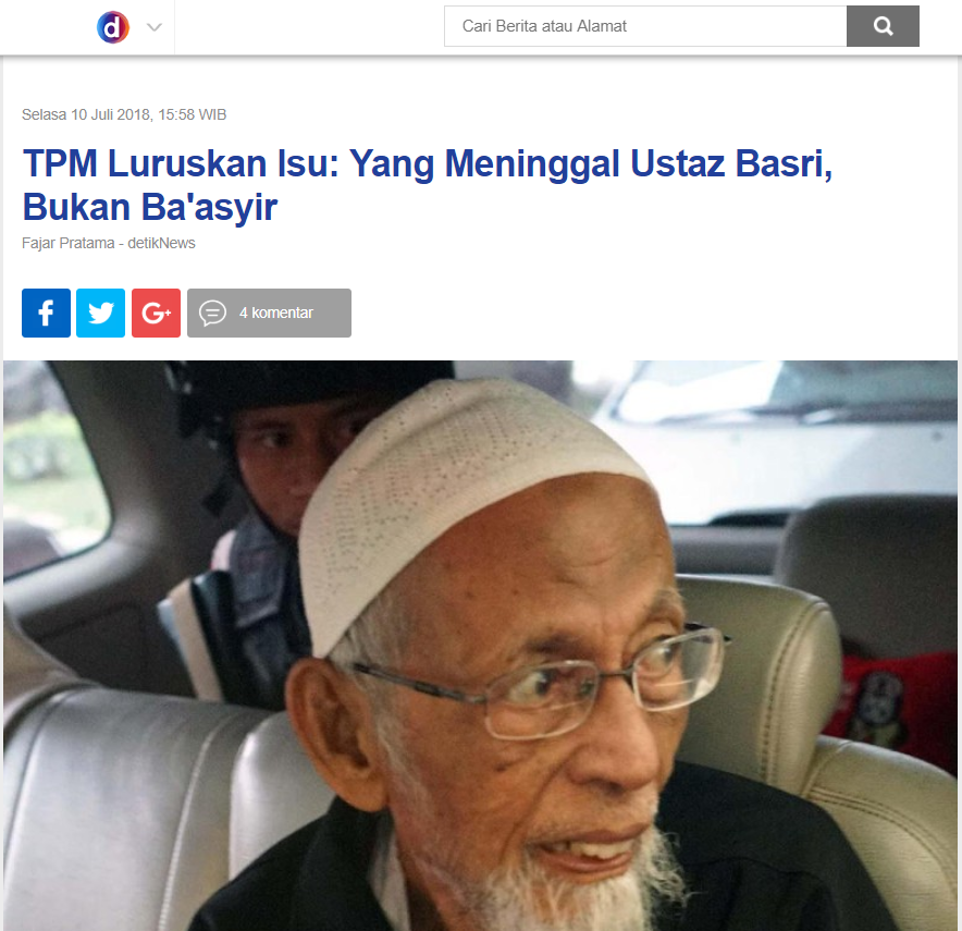Informasi dari pesan berantai Whatsapp yang menyebutkan Abu Bakar Baasyir meninggal dunia adalah informasi yang keliru. Dilansir dari detik.com, Achmad Michdan, anggota Tim Pengacara Muslim (TPM) meluruskan, sosok yang disebutkan meninggal sebenarnya ialah M Basri bukanlah Baasyir. “Itu informasinya tertukar, itu salah. Yang meninggal adalah Ustaz Basri, bukan Ustaz Ba'asyir,” ujarnya.