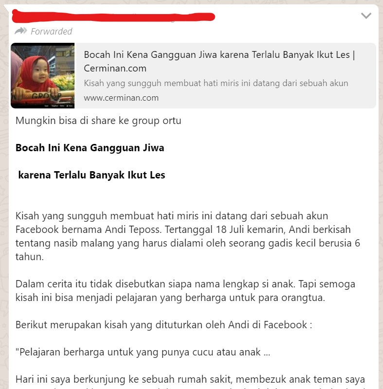 Beredar pesan berantai melalui Whatsapp mengenai narasi telah seorang bocah perempuan berusia 6 tahun mengalami gangguan jiwa. Dalam narasi itu disebutkan bahwa penyebab gangguan jiwa tersebut karena terlalu banyak mengikuti les. Berikut kutipan narasinya: