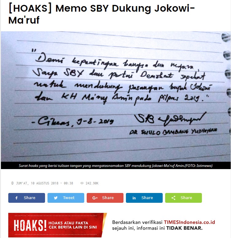 Pada Kamis malam (9/8) beredar melalui media pesan Whatsapp foto yang diklaim sebagai memo Ketua Umum Partai Demokrat Susilo Bambang Yudhoyono (SBY) mendukung pasangan Calon Presiden dan Wakil Presiden Joko Widodo dan Ma’aruf Amin. Merespon hal tersebut, dilansir dari timesindonesia.co.id, Ketua Divisi Komunikasi Publik Partai Demokrat Imelda Sari, menyatakan bahwa foto memo tersebut adalah hoaks. Ia mengatakan, memo tulisan tangan tersebut sangat tidak logis dtulis SBY. Sebab, lokasinya penulisan surat tersebut tertulis di Cikeas. “SBY dari tadi di Kuningan. Kira kira logis tidak? Hoaks,” kata Imelda.