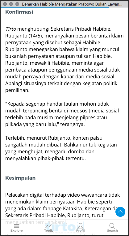 Sebelumnya beredar di Page "KataKita" dengan versi Jokowi, baik versi Jokowi maupun Prabowo sama-sama hoaks karena Habibie tidak pernah menyampaikan pernyataan atau tulisan seperti yang disebutkan di tulisan yang diedarkan. Selengkapnya di bagian PENJELASAN.