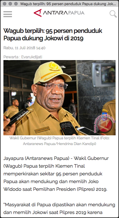 Tangkapan layar yang disertakan di post sumber adalah hasil suntingan dari post di Page Antara (facebook.com/antaranewsdotcom/), judul asli artikel adalah "Wagub terpilih: 95 persen penduduk Papua dukung Jokowi di 2019". Terlihat perbedaan tipe huruf (font) di tulisan hasil suntingan, selengkapnya di bagian PENJELASAN dan REFERENSI.