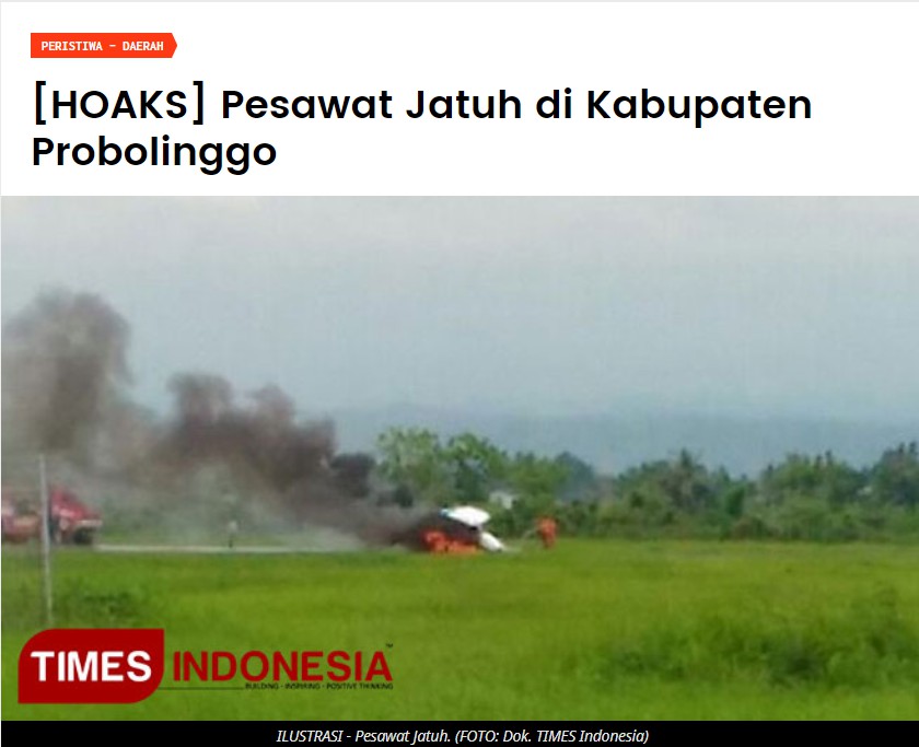 Informasi tentang pesawat jatuh di daerah Sidomukti, Probolinggo, Jawa Timur yang menyebar di media sosial merupakan informasi yang salah. Sebab, dilansir dari timesindonesia.co.id, wartabromo.com, radarbromo.co.id, dan pantura7.com, Kapolres Probolinggo, AKBP Fadly Samad menegaskan, informasi pesawat jatuh merupakan hoaks atau berita bohong. “Gak ada pesawat jatuh, info itu hoaks. Saya harap masyarakat tidak sembarangan untuk membuat informasi yang tidak akurat,” tegasnya.