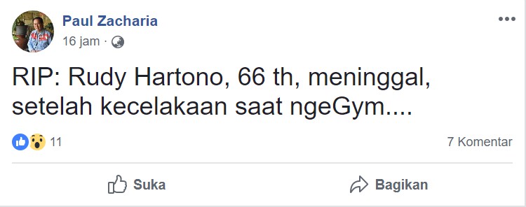 RIP: Rudy Hartono, 66 th, meninggal, setelah kecelakaan saat ngeGym....