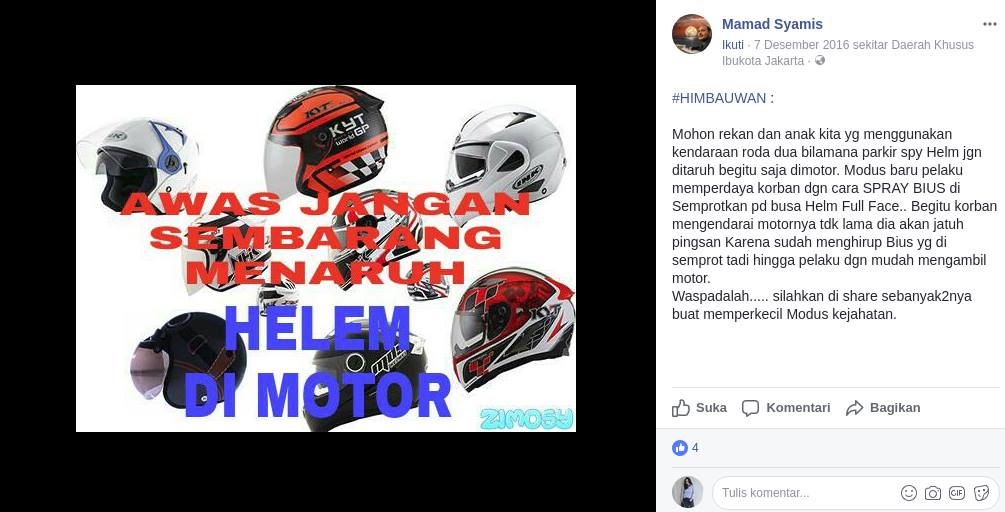 Mohon teman2 yang menggunakan kendaraan roda 2 bilamana parkir supaya helm jgn ditaruh begitu saja, apalagi saat ke ATM. Modus baru pelaku memperdaya korban dgn cara sprey/disemprotkan pd busa helm/bius. Begitu korban mengendarai motornya tdk lama dia akan jatuh pingsan hingga pelaku dgn mudah mengambil motor dan harta benda lainnya.