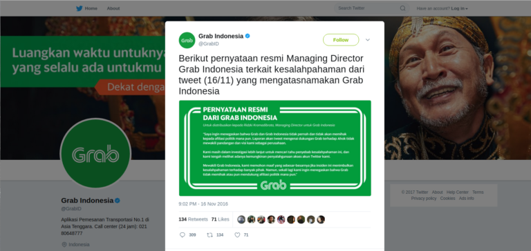 “Laporan akan tweet mengenai dukungan Grab terhadap Ahok tidak mewakili pandangan dan visi kami sebagai perusahaan,” tulis Ridzki.