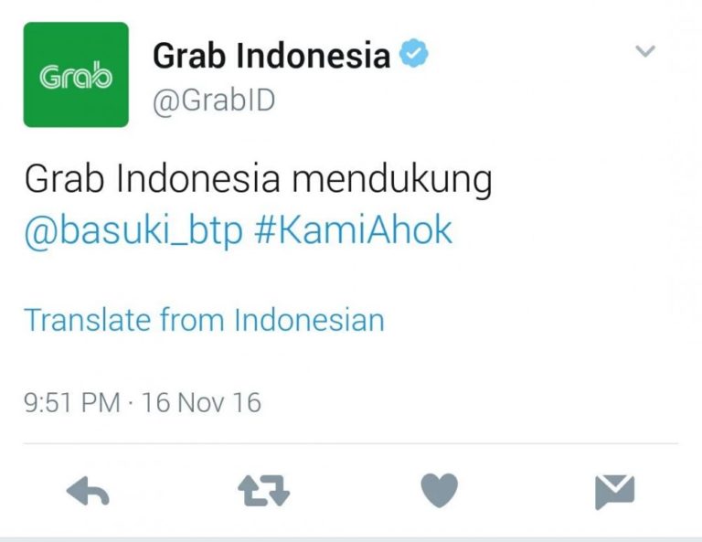 “Grab Indonesia mendukung @basuki_btp #KamiAhok,” tulis @GrabID. Tweet yang satu ini, menurut pantauan KompasTekno, sudah dihapus dari akun Twitter Grab Indonesia Kamis (17/11/2016) pagi.