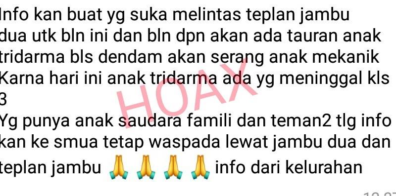 “Info kan buat yg suka melintas teplan jambu dua utk bln ini dan bln dpn akan ada tauran anak tridarma bls dendam akan serang anak mekanik Karna hari ini anak tridarma ada yg meninggal kls 3