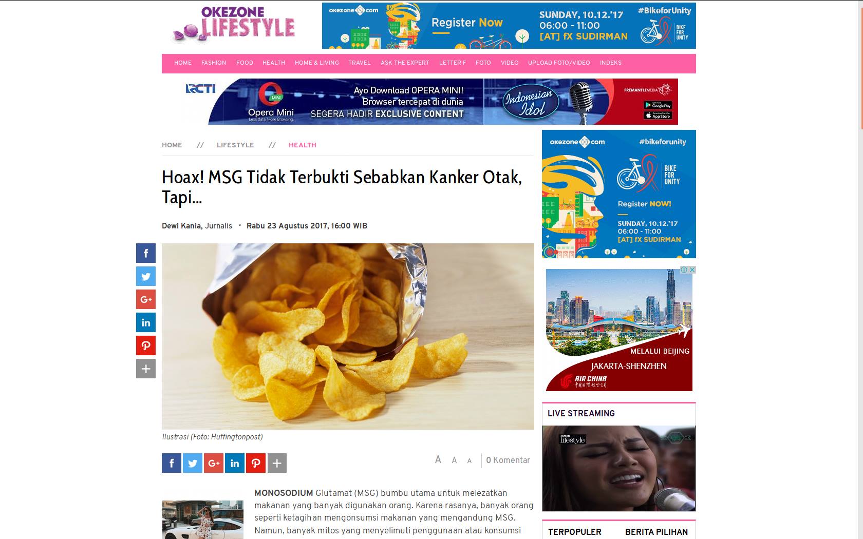 “MSG tidak terbukti menyebabkan kanker, tapi bisa merusak jaringan pankreas yang nanti mengganggu insulin. Ini terjadi kalau dikonsumsi berlebihan,” ujar dr Aru dalam Seminar Betadine Retro Run 2017 Ajak Masyarakat Berantas Mitos dan Rumor Kanker di kawasan Menteng, Jakarta Pusat, Rabu (23/8/2017).