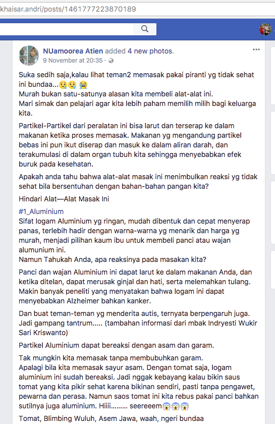 “Suka sedih saja kalau lihat teman-teman memasak pakai piranti yang tidak sehat. Murah bukan satu-satunya alasan kita membeli alat-alat ini. Mari simak dan pelajari agar kita lebih paham memilih-milih bagi keluarga kita.” Begitu kalimat pembuka pesan hoax tersebut.