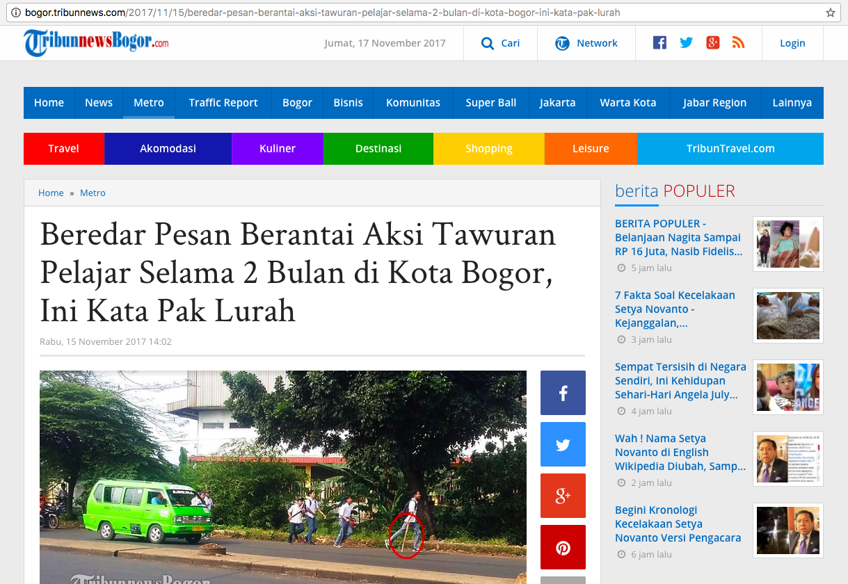 Sebuah pesan berantai beredar di media sosial WhatsApp. Isi pesan berantai tersebut berisi tentang adanya aksi tawuran yang akan dilaksanakan selama dua bulan ini di kawasan Jambu Dua, Kecamatan Bogor Utara, Kota Bogor. Selain itu pesan tersebut juga menuliskan bahwa informasi didapat dari pihak kelurahan.