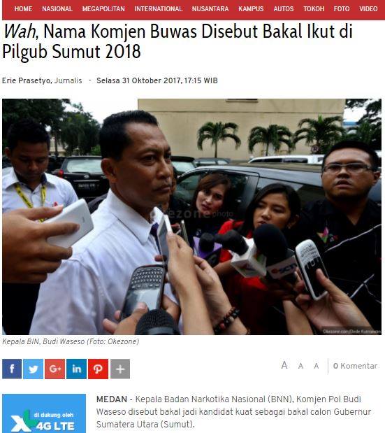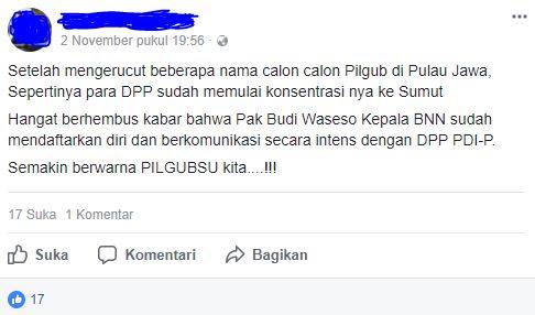 Isu Kepala Badan Narkotika Nasional (BNN) Komjen Budi Waseso (Buwas) menyalonkan diri sebagai bakal calon gubernur (Bacagub) Sumatera Utara 2018 dengan mendaftarkan diri melalui Partai Demokrasi Indonesia Perjuangan (PDIP) tidak benar adanya atau hoax.