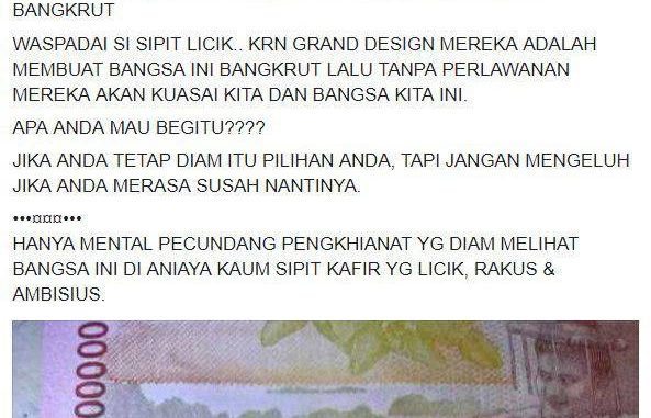 DISAAT NANTI UANG KITA TIDAK BERLAKU LAGI MAKA KITA AKAN DIPAKSA MENGGUNAKAN MATA UANG YUAN DAN DOLLAR. ITU ARTINYA KITA SDH TIDAK PUNYA APA APA LAGI ALIAS BANGKRUT. WASPADAI SI SIPIT LICIK, KRN GRAND DESIGN MEREKA ADALAH MEMBUAT BANGSA INI BANGKRUT LALU TANPA PERLAWANAN MEREKA AKAN KUASAI KITA DAN BANGSA KITA INI.