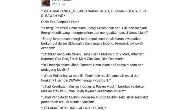 Melalui twitter dan instagram akun pribadi Eep Saefulloh Fatah, dia langsung mengklarifikasi pernyataan yang mengandung unsur penghasutan dari akun facebook milik Abi Amanillah, Senin (2/10/17). Eep Saefulloh Fatah menyatakan bahwa ajakan jihad ekonomi yang mengatasnamakan dirinya itu bohong.