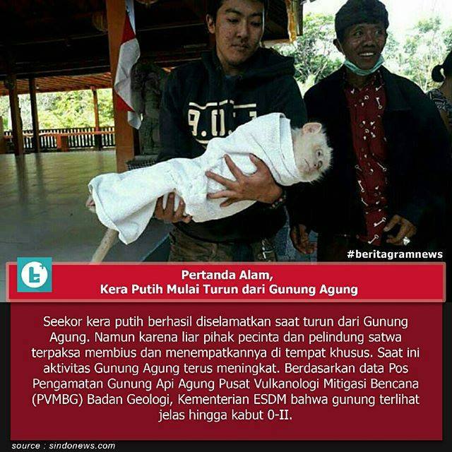 Beredar foto dan pemberitahuan di media sosial mengenai tertangkapnya seekor kera putih sebagai pertanda erupsi, yang menghebohkan masyarakat disekitar Gunung Agung di kabupaten Karang Asem Bali.