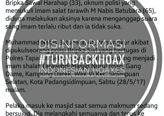 Menurut Indonesian Hoaxes, peristiwa tersebut kurang tepat. Dilansir dari Tribratanews, Kabid Humas Polda Sumut, Kombes Pol. Dra Rina Sari Ginting memberikan pernyataan bahwa tidak ada terjadi pemukulan terhadap Imam Shalat Tarawih yang terjadi pada tanggal 28 Mei 2017 yang lalu. Akun yang memberitakan HOAX tersebut mengutip pemberitaan yang sudah lama terjadi bulan Juli 2013.