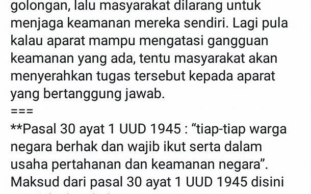 Pasal 30 ayat 1 UUD 1945 memang betul disebutkan bahwa rakyat punya hak dan kewajiban menjaga kemanan negara. Tapi, hal ini jelas dalam pengertian umum. Pada ayat berikutnya, yakni pasal 30 ayat 2, bahwa usaha pertahanan dan keamanan negara dilaksanakan melalui sistem pertahanan dan keamanan rakyat semesta oleh Tentara Nasional Indonesia dan Kepolisian Negara Republik Indonesia, sebagai kekuatan utama, dan rakyat, sebagai kekuatan pendukung. Artinya, TNI dan Polri-lah yang diberi wewenang sebagai kekuatan utama. Jadi, rakyat sebagai kekuatan pendukung saja.