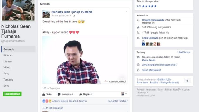 Pada akun Facebook @nspurnamaofficial, postingan yang bertuliskan “Everything will be fine in time, Always support u dad” banyak mendapat respon oleh netizen. Namun diketahui ternyata akun tersebut bukanlah milik dari anak Basuki Tjahaja Purnama atau Ahok. Klarifikasi sudah diperoleh di video wawancara Sean bersama SPH (Sekolah Pelita Harapan) Voice, di detik 39 Sean mengklarifikasi mengenai akun palsu ini.