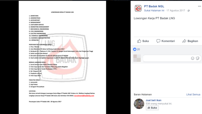 Postingan foto lowongan pekerjaan di PT Badak LNG. Lowongan pekerjaan itu meliputi bagian pemasaran, trading, dan CS. Adapun, tingkatan lowongan itu mulai dari tingkatan dari SMK/SMA hingga S1. Dalam postingan itu dikatakan bahwa untuk melamar pekerjaan tersebut harus mengirimkan berkasnya ke domain ptbadakngl.com