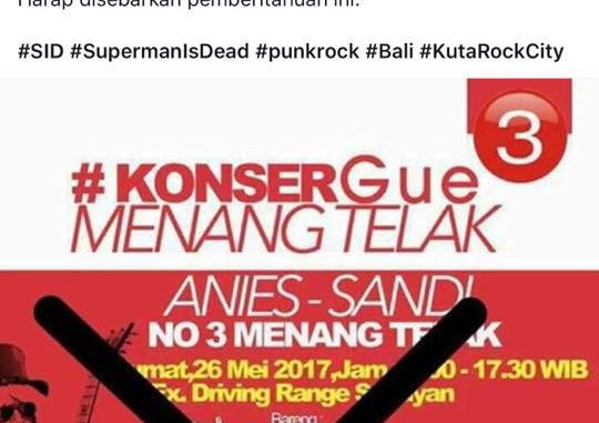 Drummer dari grup band Superman Is Dead (SID) melalui akun Facebooknya JRX membantah jika bandnya adalah pengisi acara dalam kampanye Anies – Sandi. Berikut pernyataan lengkapnya;