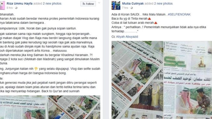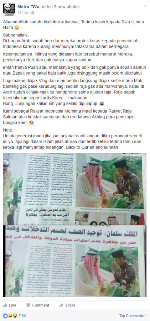 Beredar berita hasut ‘terjemahan’ koran berbahasa Arab bahwa pemerintah Indonesia kurang memiliki tata krama terhadap Raja Salman dalam kunjungannya ke Indonesia. Berita hasut ini kemudian juga disebarkan kembali oleh akun-akun media sosial lainnya.