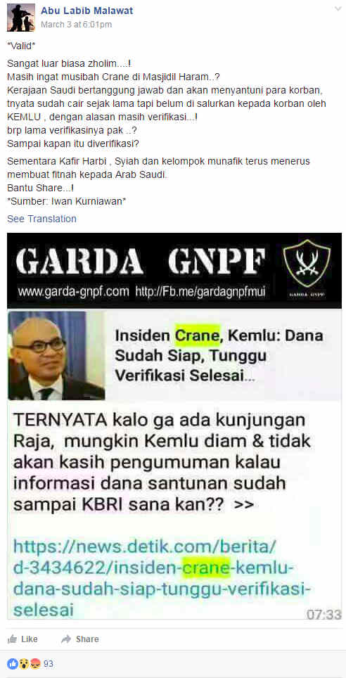 Sebuah akun Facebook dengan nama ‘Abu Labib Malawat’ memposting gambar pada grup Facebook ‘Boikot Metro TV Krn Melakukan Pembodohan Publik’ dengan narasi yang mengklaim bahwa dana santunan korban crane jatuh sudah cair sejak lama tapi belum disalurkan oleh Kemlu: