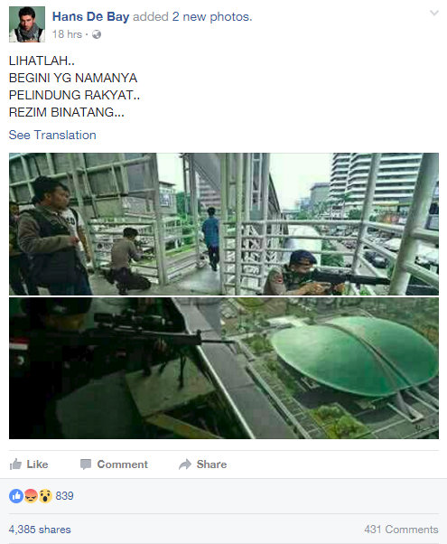 Sebuah akun Facebook dengan nama Hans De Bay memposting foto-foto dengan narasi yang menghasut sebagai berikut: