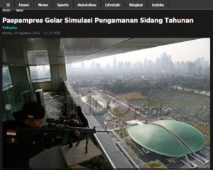 Foto pertama adalah simulasi pengamanan sidang tahunan MPR tahun 2015 yang berasal dari Sindonews.com tertanggal 13 Agustus 2015.