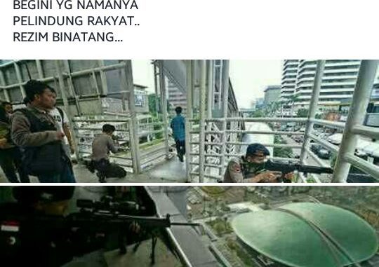 Narasi yang menghasut dengan dilampirkan foto aparat dengan senjata terhunus di tengah masyarakat seakan memberi pesan bahwa aparat sedang menjadikan masyarakat sebagai sasaran. Padahal foto-foto ini berasal dari peristiwa simulasi pengamanan.