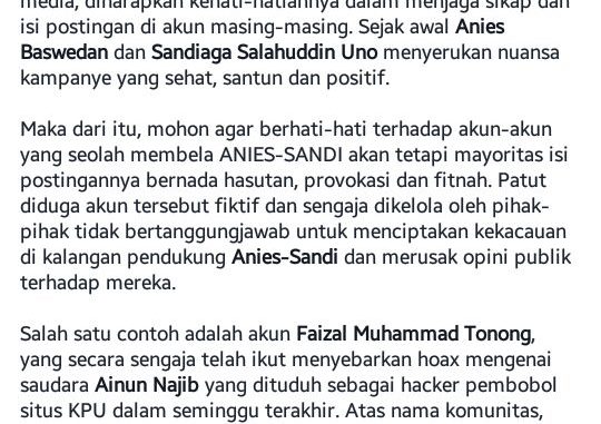 Relawan Calon Gubernur-Wakil Gubernur Anies Baswedan dan Sandiaga Uno melakukan klarifikasi atas tindakan akun atas nama Faizal Muhammad Tonong yang mengaku sebagai relawan Anies-Sandi. akun Faizal Muhammad Tonong bukanlah relawan Anies-Sandi. Adapun, tindakannya itu tidak mewakili sikap dari relawan Anies-Sandi. Dengan demikian, tindakan atau perilaku dari akun tersebut adalah tindakan pribadi.