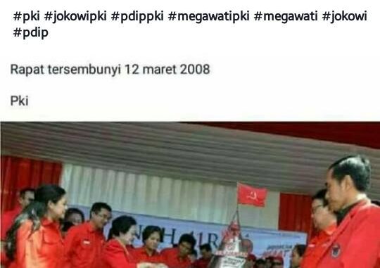 Menurut penelusuran Fanpage Indonesian Hoaxes, foto Presiden Joko Widodo dan Mantan Presiden Ke-5 Megawati Soekarnoputri memotong tumpeng di atas meja berlogokan PKI adalah rekayasa foto. Sebab, foto aslinya adalah hasil jepretan dari Widodo S Jusuf (ANTARA).