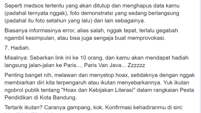 Penting banget nih, melawan dan menyetop hoax, setidaknya dengan nggak membiarkan diri kita terpengaruh atau ikutan menyebarkannya. Yuk ikutan ngobrol publik tentang “Hoax dan Kebijakan Literasi” dalam rangkaian Pesta Pendidikan di Kota Bandung.