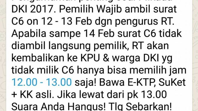 Pengumuman penting soal Pilkada DKI 2017. Pemilih Wajib ambil surat C6 on 12 – 13 Feb dgn pengurus RT. Apabila sampe 14 Feb surat C6 tidak diambil langsung pemilik, RT akan kembalikan ke KPU & warga DKI yg tidak milik C6 hanya bisa memilih jam 12.00 – 13.00 saja! Bawa E-KTP, SuKet + KK asli. Jika lewat dari pk 13.00 Suara Anda Hangus! Tlg Sebarkan! Thank you