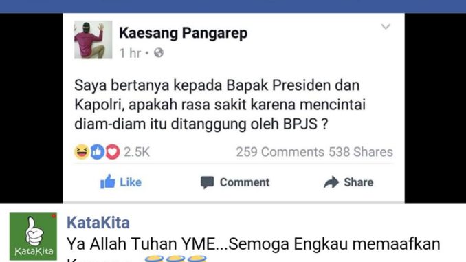 Saya bertanya kepada Bapak Presiden dan Kapolri, apakah rasa sakit karena mencintai diam-diam itu ditanggung oleh BPJS?