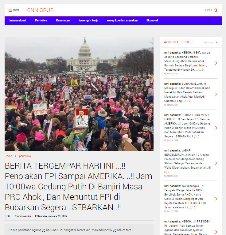 Sebuah situs dengan nama domain cnngrup.com mengklaim bahwa di Gedung Putih Amerika dibanjiri massa pro Ahok yang menuntut pembubaran FPI.