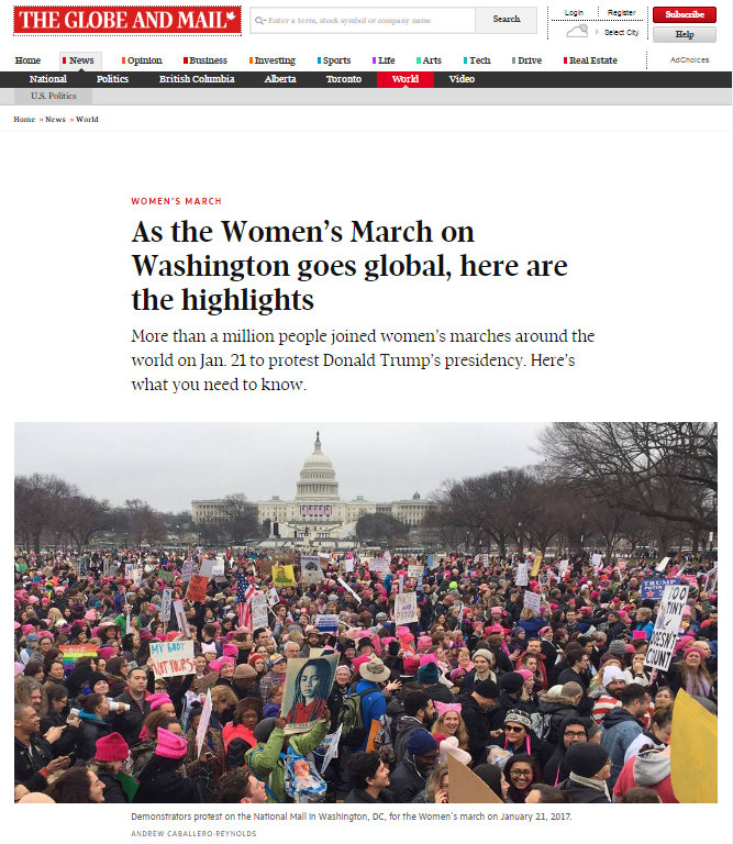 Foto berasal dari kejadian protes warga Amerika terhadap Presiden Amerika Donald Trump pada tanggal 21 Januari di Washington sebagaimana yang disebut dalam laman artikel situs theglobeandmail.com, yang disebutkan bahwa acara tersebut adalah pawai wanita di seluruh dunia pada 21 Januari 2017 untuk memprotes kepresidenan Donald Trump.