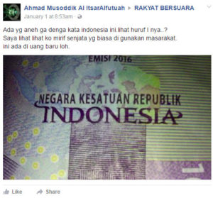 Sebuah akun Facebook memposting gambar bagian dari uang Rupiah emisi 2016 dilengkapi dengan status: