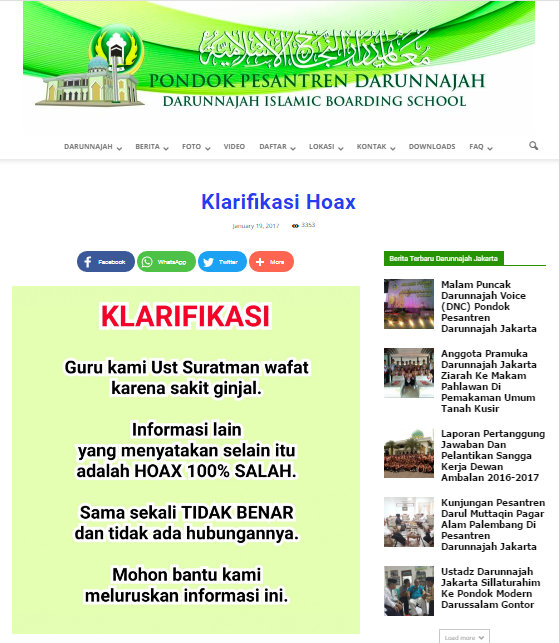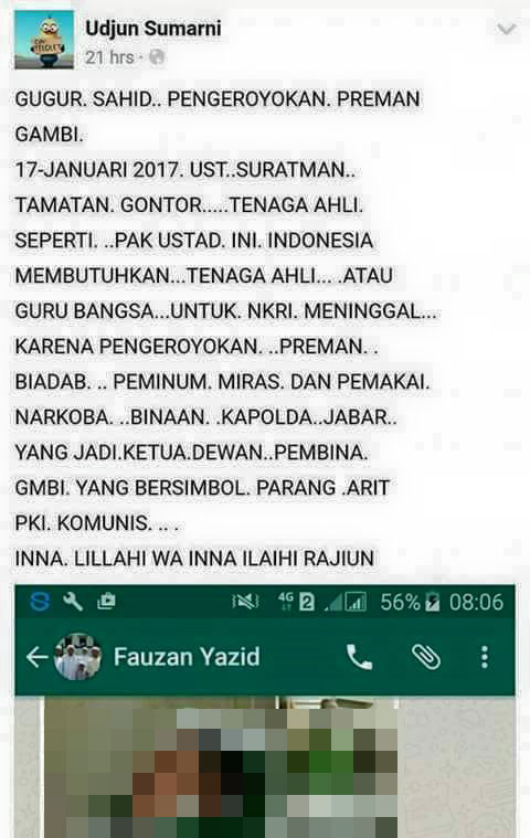 Beredar kabar di sosial media bahwa Ustadz Suratman – seorang guru di Pesantren Darunnajah Cipinang. – menjadi korban korban pengeroyokan kader GMBI dan kemudian meninggal dunia.