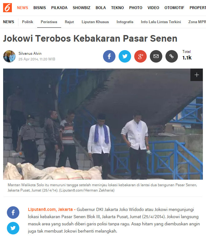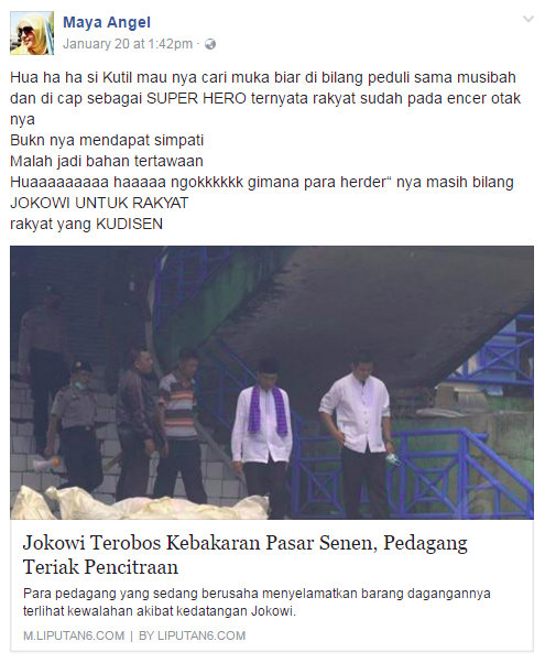 terdapat sebuah postingan dalam sosial media yang menampilka tautan dari sebuah situs berita dengan judul artikel "Jokowi Terobos Kebakaran Pasar Senen Pedagang Teriak Pencitraan", dengan keterangan postingan :