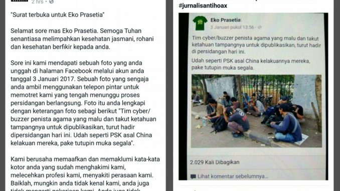 Sore ini kami mendapati sebuah foto yang anda unggah di halaman Facebook melalui akun anda tanggal 3 Januari 2017. Sebuah foto yang sengaja anda ambil menggunakan telepon pintar untuk memotret kami yang tengah menunggu proses persidangan berlangsung. Foto itu anda lengkapi dengan keterangan foto sebagi berikut “Tim cyber/buzzer penista agama yang malu dan takut ketahuan tampangnya untuk dipublikasikan, turut hadir dipersidangan hari ini. Udah seperti PSK asal China kelakuan mereka, pake tutupin muka segala”.