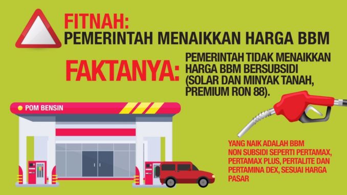 -Pemerintah tidak menaikkan harga BBM bersubsidi (Solar, MInyak Tanah, dan Premium RON 88). Yang naik adalah BBM bersubsidi seperti Pertamax, Pertamax PLus, Pertalite, dan Pertamina DEX sesuai dengan harga pasar.