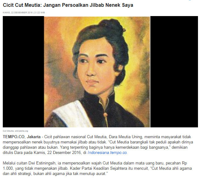 TEMPO.CO, Jakarta - Cicit pahlawan nasional Cut Meutia, Dara Meutia Uning, meminta masyarakat tidak mempersoalkan nenek buyutnya memakai jilbab atau tidak. “Cut Meutia barangkali tak peduli apakah dirinya dianggap pahlawan atau bukan. Yang terpenting baginya hanya kemerdekaan bagi bangsanya,” demikian ditulis Dara pada Kamis, 22 Desember 2016, di Indonesiana.tempo.co.