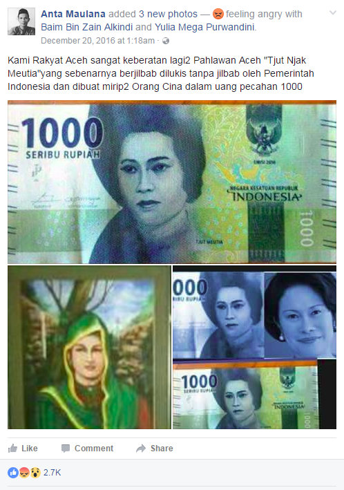Kami Rakyat Aceh sangat keberatan lagi2 Pahlawan Aceh “Tjut Njak Meutia”yang sebenarnya berjilbab dilukis tanpa jilbab oleh Pemerintah Indonesia dan dibuat mirip2 Orang Cina dalam uang pecahan 1000.