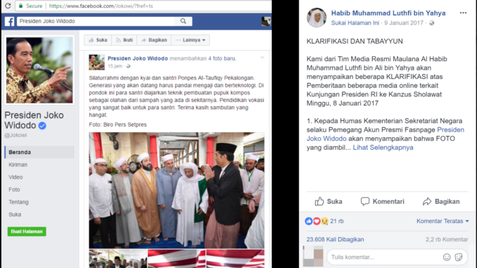 Pertama, kepada Humas Kementerian Sekretariat Negara selaku Pemegang Akun resmi Fanspage Presiden Joko Widodo akan menyampaikan bahwa FOTO yang diambil di postingan berikut ini adalah Foto Kunjungan Presiden dalam acara Maulid Nabi di Kanzus Sholawat, Pekalongan, bukan di Ponpes At-Taufiqi, Pekalongan .