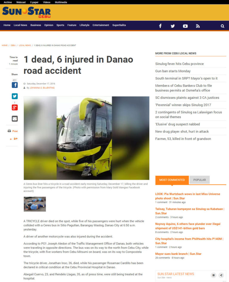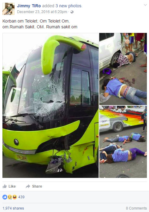 Menurut artikel laman situs sunstar.com tertanggal 17 Desember 2016 ini adalah foto kecelakaan di Filipina, sebuah kendaraan semacam becak bermotor bertabrakan dengan bis mengakibatkan pengemudi becak bermotor tewas di tempat dan beberapa orang lainnya luka-luka.