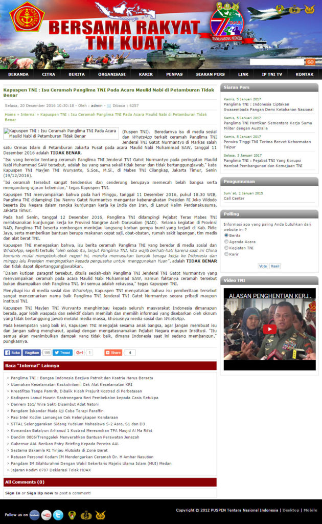 “Beredarnya isu di media sosial dan WhatsApp terkait ceramah Panglima TNI Jenderal TNI Gatot Nurmantyo di Markas salah satu Ormas Islam di Petamburan Jakarta Pusat pada acara Maulid Nabi Muhammad SAW, tanggal 11 Desember 2016 adalah TIDAK BENAR.