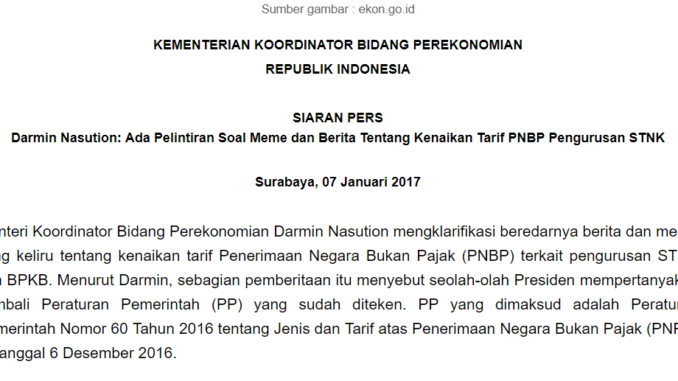 Terkait beredarnya kabar dan meme perihal kenaikan tarif PNBP, Menteri Koordinator Bidang Perekonomian Darmin Nasution angkat bicara dan melakukan klarifikasi. Menurut Darmin, sebagian pemberitaan itu menyebut seolah-olah Presiden mempertanyakan kembali Peraturan Pemerintah (PP) yang sudah diteken. PP yang dimaksud adalah Peraturan Pemerintah Nomor 60 Tahun 2016 tentang Jenis dan Tarif atas Penerimaan Negara Bukan Pajak (PNPB) tertanggal 6 Desember 2016.